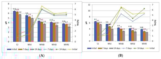 Evolution in time (0–14 days) of pH and titratable acidity (TA) of jelly samples. (A) Jelly samples stored at 4 °C. (B) Jelly samples stored at ambient temperature (20–25 °C). The columns express pH values, and the lines expresses titratable acidity (TA) values.