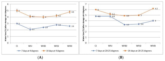 Figure 2 presents the evolution of the pH and titratable acidity of samples, initially and after storage for 7 and 14 days at 4 °C and ambient temperature (20–25 °C). It can be observed that, initially, the pH of the whey sample (WhJ) is relatively neutral to slightly acidic (5.6) and low titratable acidity (0.8) was recorded, because whey has a composition rich in proteins and lactose, but does not contain many free organic acids. Whey and fruit jellies (WhSJ/WhBJ/WhRJ) initially have a lower pH (3.86–4.40) and higher acidity (5.2–6.6), due to the citric, malic, and other natural organic acids found in berries. CJ is prepared only on the basis of water, sugar, and gelatin, so the initial pH is slightly neutral (6.5), and the acidity is very low, almost negligible, because there are no natural organic acids present as in fruits. The titratable acidity and pH of berry fruits were determined initially and the values obtained for pH were between 2.9 and 4.4, with the titratable acidity being between 1.3 and 3.5%, with blueberries being less acidic compared to raspberries and strawberries. The average values for pH in the case of sweet whey used in the production of jellies were 6.6, and the titratable acidity was 1.6%.