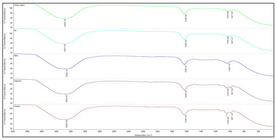 For FTIR analysis equipment, Nicolet Is50 FT-IR (Thermo Fisher Scientific, Waltham, MA, USA) equipped with an ATR crystal was used. FTIR-ATR spectroscopy, or Attenuated Total Reflectance Fourier Transform Infrared spectroscopy, was performed at room temperature by using a Nicolet™ iS50 FTIR Spectrometer. The IR spectra were obtained in the spectral range of 4000–400 cm−1, with 32 scans at a 4 cm−1 resolution [24].