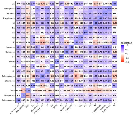 Texture parameters are closely related to each other, indicating that changes in one mechanical property (e.g., hardness) are also reflected in the others: cohesiveness–chewiness (0.97), gumminess–chewiness (0.98).