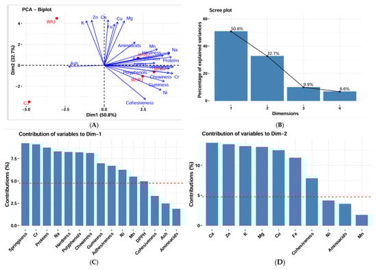 The first principal component factor is significant: it expresses itself in 50.82% of the data variability (Figure 7B). This observation suggests that this axis carries great information. The most important contribution for this component comes from the following variables: springiness, Cr, proteins, Na, hardness, polyphenols, chewiness, gumminess, adhesiveness, Ni, Mn, and DPPH are highly correlated with this dimension These variables could therefore summarize themselves as dimension 1 (Figure 7C).