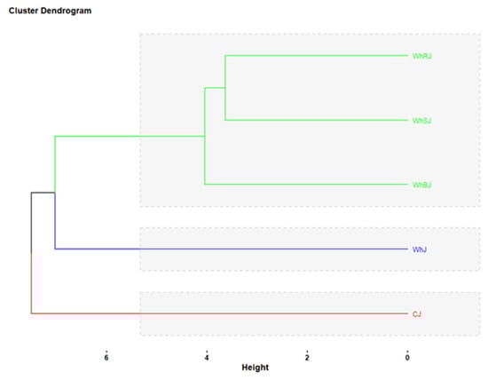 The hierarchical classification, represented by a dendrogram (Figure 8), grouped jelly samples into three distinct clusters. The first cluster, consisting of WhRJ, WhSJ, and WhBJ samples, indicates a high similarity among them, which can be attributed to similar compositional characteristics. The second cluster includes the WhJ sample, which presents an intermediate profile, different from the previous group but not entirely divergent. The third cluster, represented solely by the CJ sample, is the farthest from the others, suggesting a distinct profile, likely determined by variations in formulation, ingredients, or physicochemical properties.