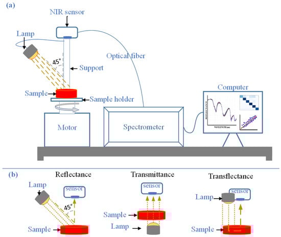 NIR Spectroscopy System: (a) Components of the NIR spectroscopy system; (b) Diagram of spectral acquisition modes. Adapted from Chikri et al. [40].