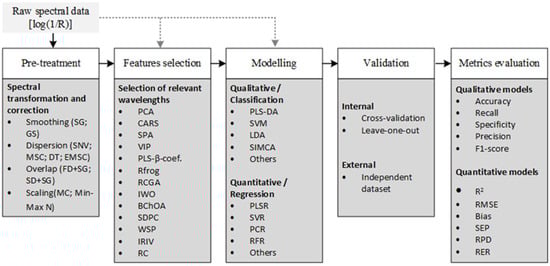The development of robust chemometric models for detecting adulteration in powdered foods fundamentally depends on the following stages: spectral preprocessing, selection of relevant features, classification or regression model, validation, and evaluation of metrics [61,62]. The main strategies used in the reviewed studies are described below. Figure 2 illustrates the general workflow from raw spectral data acquisition to model evaluation to provide a comprehensive overview of this process.