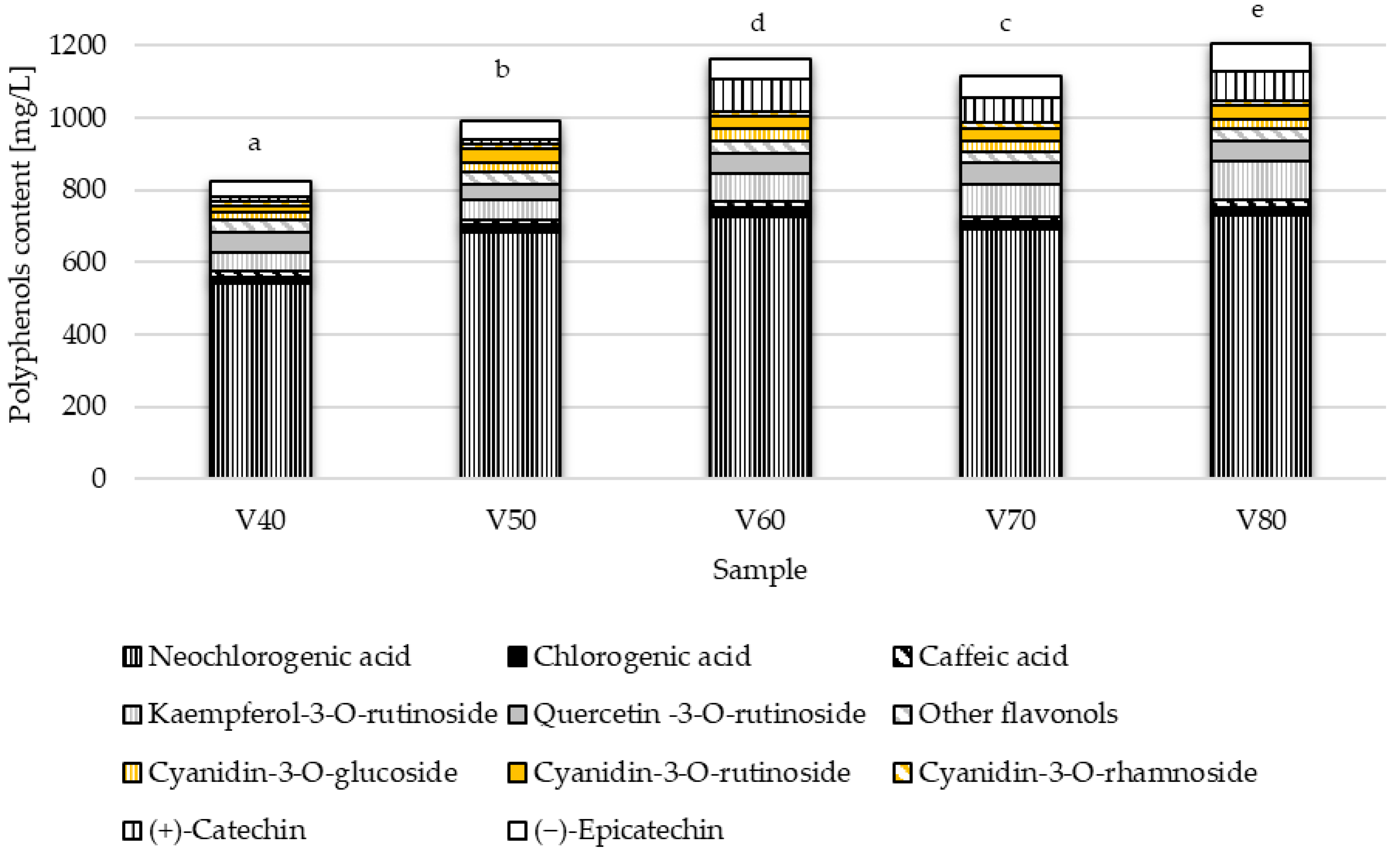 v) during the first stage of the study. However, if polyphenol groups are considered separately, it should be noted that anthocyanins are an exception, for which it is best to use 60–70% ethanol for extraction. In the group of phenolic acids, similar results were achieved with 60% and 80% ethanol (766.60 mg/L and 770.41 mg/L, respectively). The most significant impact of alcohol concentration on the amount of extracted compounds was observed in the flavan-3-ols group, where the concentration of these compounds in the V40 sample was 57.01 mg/L. In contrast, in the V80 sample, it was 155.11 mg/L. In the flavonols group, the extraction efficiency increased with the rising concentration of the applied alcohol. The obtained results can be explained by the fact that ethanol concentration influences solvent polarity, which in turn affects the solubility of different classes of phenolic compounds. Higher ethanol content can enhance the extraction of less polar compounds, such as hydroxycinnamic acids. The extraction of bioactive compounds from plant materials using organic solvents occurs through mass transfer, including convective diffusion at the particle surface and molecular diffusion within the particles [