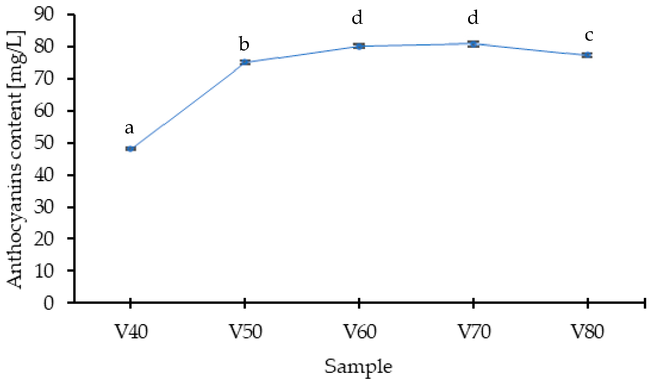 Figure 2), with no statistically significant difference in the V60 and V70 samples. Due to their molecular structure (numerous hydroxyl and glycosyl groups), anthocyanins are compounds that dissolve well in polar solvents, so it can be assumed that in solvents containing relatively high amounts of water, extraction will be high. The obtained results indicate that in 40% ethanol, the recovery of anthocyanins is the lowest; this may stem from the specifics of the fruit form used, namely that whole, undamaged blackthorn fruits were subjected to extraction, and in this case, the ethanol concentration was insufficient for effective penetration of the cellular structures. Kotsou et al. [