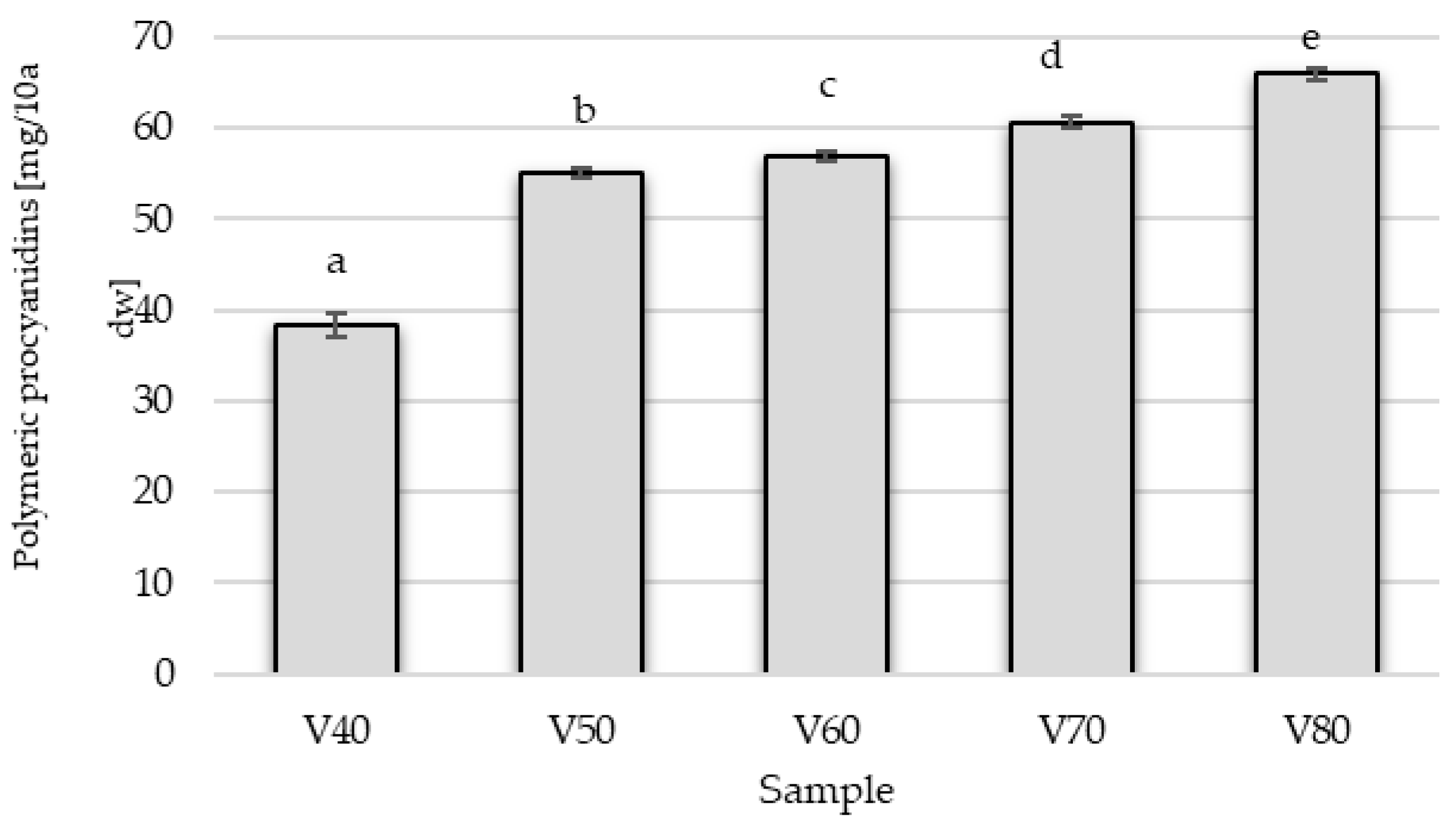 Table 4). The highest concentration of polymeric procyanidins was in the tincture in which the fruit peel was mechanically damaged before maceration (V4). The optimal maceration time for samples in which sugar was added on the 56 day of the process—regardless of the raw material pre-treatment method—was 56 days. In contrast, the sample in which sugar was added at the beginning of the process exhibited the lowest content of polymeric procyanidins. The influence of the tested factors is supported by the statistical analysis (