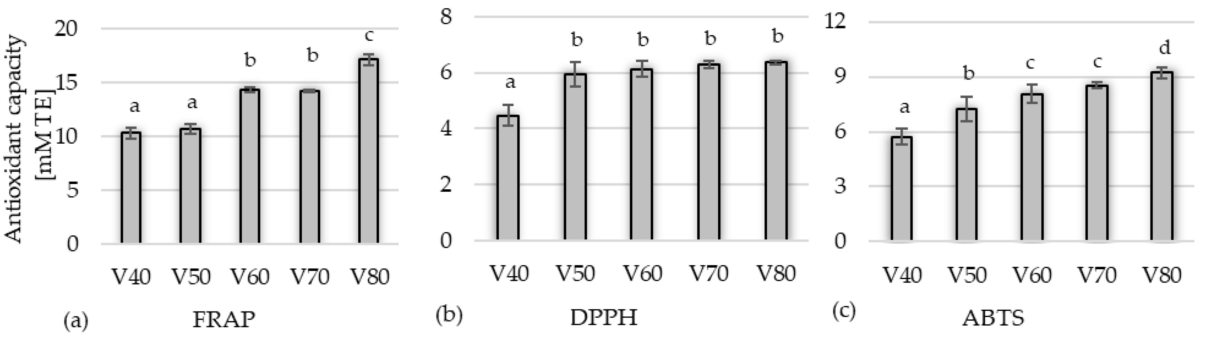 p < 0.05) in the samples from V50 to V80. The antioxidant capacity measured by all methods was strongly correlated with the content of polyphenolic compounds. This study confirms the other reports, e.g., Popović et al. [