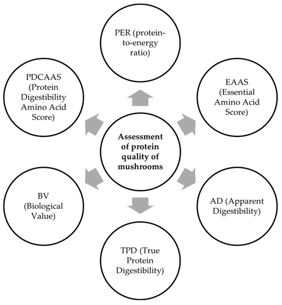 The properties, quality, and digestibility of proteins in mushrooms can be analyzed and compared by considering several parameters that characterize the protein as a whole or each amino acid individually (Figure 2): PER (protein-to-energy ratio), EAAS (Essential Amino Acid Score), AD (Apparent Digestibility), TPD (True Protein Digestibility), BV (Biological Value), and PDCAAS (Protein-Digestibility-Corrected Amino Acid Score) [8]. These properties provide a comprehensive overview of the nutritional values of a particular species or of mushrooms as a whole.