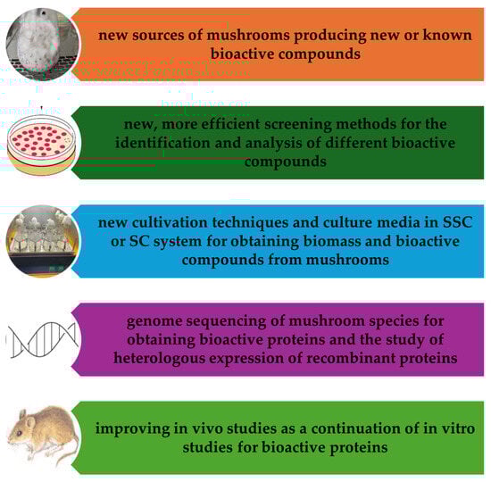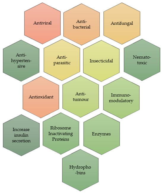 This group of proteins includes the following categories: lectins (glycoproteins), immunomodulatory proteins, enzymes (laccase, cellulases, ribonucleases), ergothioneine [95], enzyme inhibitors, ribosome-inactivating proteins, and hydrophobins [96].