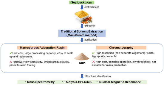 The chromatographic process is characterized by its ability to achieve high levels of resolution, which is a prerequisite for the analysis of complex samples. The primary influencing factors of this method comprise the type of column packing, the composition of the eluent, and the flow rate. Additionally, it is imperative to consider the effects of pH and temperature on the stability of the extract [42]. Sephadex column chromatography is a common method for purifying SBPs. In the study of Arimboor et al. [27], 500 mg of crude proanthocyanidin extract was suspended in 95% (v/v) ethanol and loaded onto a Sephadex LH-20 column previously equilibrated with 95% ethanol (v/v). After this, the column was thoroughly flushed with 1 L of 95% ethanol (v/v), and then the crude extract was eluted with 1.5 L of 50% acetone until no proanthocyanidins were detected in the eluate, with a purity of 59.5% to 70.4%. Rösch et al. [18] used Sephadex LH-20 gel chromatography to isolate proanthocyanidins from sea buckthorn pomace. The column was washed with 400 mL of water, after which the methanol content of the eluent was increased from 0 to 100% (v/v) in 10% increments. Elution was continued with two portions of an acetone-water mixture (70:30, v/v), and the fractions were designated A–M. The relatively high purity of proanthocyanidins extracted by chromatography renders them suitable for laboratory research; however, their industrial application is limited by the high cost of dedicated columns and organic solvents. Recent advancements, such as the utilization of deep eutectic solvents (DES) as mobile phase modifiers, have the potential to enhance selectivity and reduce reliance on contaminating organic solvents [43].