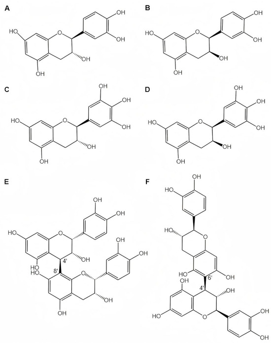 Monomeric structure and linkage patterns of SBPs. (A) catechin; (B) epicatechin; (C) gallocatechin; (D) epigallocatechin; (E) Typical C4 → C8 linkage pattern (exemplified by Proanthocyanidin B2); (F) Typical C4 → C6 linkage pattern (exemplified by Proanthocyanidin B6).