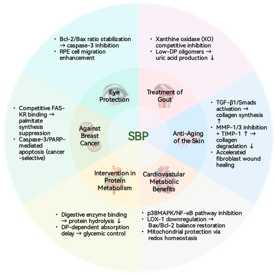SBPs offer a potential strategy for managing gout, a prevalent inflammatory arthritis affecting millions worldwide [73] and leading to chronic disability if left untreated [74], by directly inhibiting the pivotal enzyme xanthine oxidase (XO). Biochemical assays have demonstrated that SBPs competitively bind to the active site of XO, and this inhibitory activity is dependent on the DP. Specifically, oligomeric fractions (ADP = 3.7–5.7) exhibited 2.3 times the inhibitory efficiency of higher DP fractions (ADP = 8.5) in reducing uric acid production [28]. While the direct inhibition of a key enzyme in an in vitro assay provides a clear molecular target, confirming the clinical relevance of this finding requires in vivo studies to demonstrate a corresponding reduction in systemic uric acid levels.