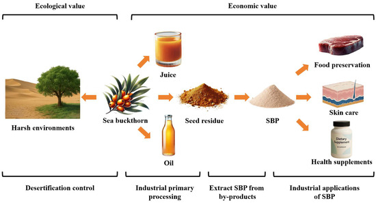 Figure 4 illustrates the ecological and economic value of sea buckthorn, with a specific focus on the industrial applications of SBPs.