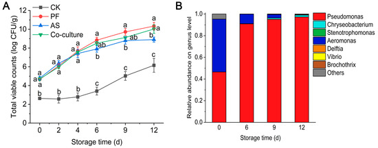 Microbial characteristics of refrigerated grass carp. (A) Changes in total viable count of refrigerated grass carp inoculated with P. fragi, A. salmonicida, and their co-culture during storage. (B) Microbial composition in refrigerated grass carp fillets in the co-culture group at genus level. Different letters represent significant differences (p < 0.05) between different groups at the same day. CK, PF, and AS represent control, P. fragi, and A. salmonicida, respectively.