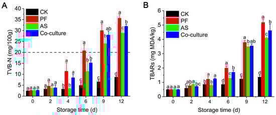 TVB-N, which comprises alkaline nitrogenous compounds including ammonia and amines, is a critical freshness indicator for aquatic products [35]. As illustrated in Figure 2A, compared with the CK group, the TVB-N levels in the three bacterial inoculated groups increased rapidly as the storage time extended, indicating that microbial activity is the primary driver of increases in TVB-N. From day 4 onward, the P. fragi group showed significantly higher TVB-N levels compared with the A. salmonicida and co-culture groups (p < 0.05), highlighting the important role of P. fragi in TVB-N production. Similarly, Wang et al. [36] and Ge et al. [37] also demonstrated that P. fragi showed a significant TVB-N production capacity in yellow catfish and large yellow croaker. Specifically, the TVB-N level in the P. fragi group exceeded China’s regulatory limit of 20 mg/100 g for freshwater fish (GB 2733-2015 [38]), reaching 20.84 mg/100 g at day 6, which was 11.39 mg/100 g and 15.25 mg/100 g in the A. salmonicida and co-culture groups, respectively. These results suggested that the potential TVB-N production of A. salmonicida was weaker than that of P. fragi. TVB-N generally originates from the degradation of proteins and other nitrogen (N)-containing compounds due to the activity of spoilage bacteria [39]. The rapid accumulation of TVB-N in the P. fragi group was mainly attributed to its strong adaptation to low-temperature environments or its high proteolytic activity [40]. Liu et al. [41] discovered a protease named AprA from P. fragi, which degraded myofibrillar and sarcoplasmic proteins, leading to an increase in TVB-N levels. Notably, the accumulation of TVB-N in the co-culture group was higher than that of the A. salmonicida mono-culture at the end of refrigeration storage; this was attributed to the predominance of Pseudomonas spp., consistent with the results of microbial proliferation.