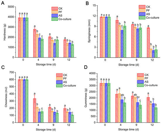 The change in hardness (A), springiness (B), chewiness (C), and gumminess (D) of different treatment groups during storage at 4 °C. Different letters represent significant differences (p < 0.05) between different groups at the same day. CK, PF, and AS represent control, P. fragi, and A. salmonicida, respectively.