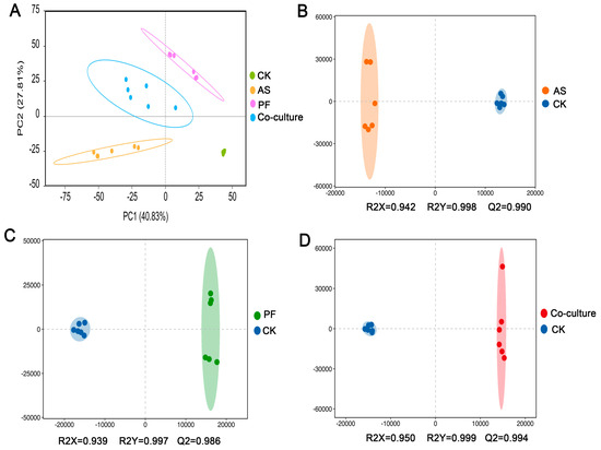 OPLS-DA, a supervised multivariate technique, is usually employed to remove orthogonal variation unrelated to class discrimination [48]. Model robustness is evaluated using R2Y and Q2, which denote the goodness of fit and predictive capacities of the model, respectively. OPLS-DA was employed to evaluate the relationships between A. salmonicida, P. fragi, and their co-culture relative to the CK group. Figure 4B revealed that the AS and CK groups were clearly separated, with R2Y = 0.998 and Q2 = 0.990, indicating significant metabolic differences and a reliable predictive capability. Similar distinctions were also observed between the PF and CK groups (Figure 4C), as well as between the co-culture and CK groups (Figure 4D), demonstrating the effectiveness of the OPLS-DA model.