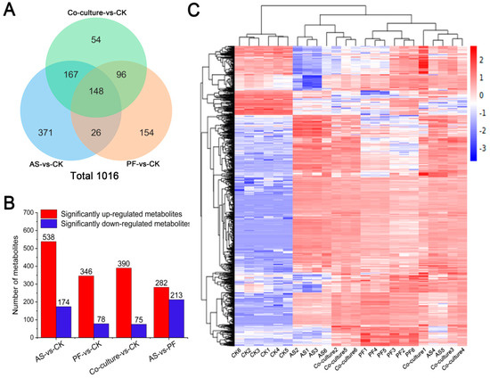 Venn diagram for the four groups of comparison (A). The number of differential metabolites among different groups (B). Heatmap of the 1016 different metabolites in different treatment groups of refrigerated grass carp (C). CK, AS, and PF represent control, A. salmonicida, and P. fragi, respectively.