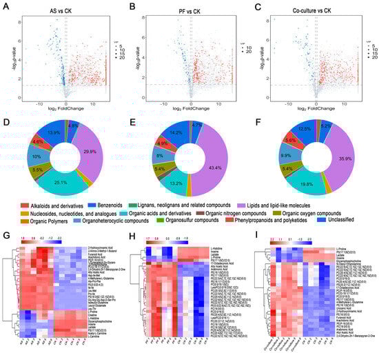 Volcano plots of differential metabolites between A. salmonicida and CK groups (A), P. fragi and CK groups (B), and co-culture and CK groups (C). Compositions of metabolic types between A. salmonicida and CK groups (D), P. fragi and CK groups (E), and co-culture and CK groups (F). Heatmap of clustering hierarchical analysis of the top 30 differential metabolites between A. salmonicida and CK groups (G), P. fragi and CK groups (H), and co-culture and CK groups (I). CK, AS, and PF represent control, A. salmonicida, and P. fragi, respectively.