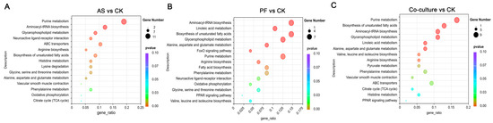 KEGG enrichment pathway analysis between A. salmonicida and CK groups (A), P. fragi and CK groups (B), and co-culture and CK groups (C). CK, AS, and PF represent control, A. salmonicida, and P. fragi, respectively.