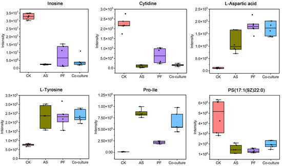 In this study, six key metabolites were identified as potential spoilage biomarkers in grass carp: inosine, cytidine, L-aspartic acid, L-tyrosine, Pro-Ile and PS(17:1(9Z)22:0) (Figure 8). Inosine and cytidine play a vital role in nucleic acid metabolism [65]. The abundance of both metabolites was consistently downregulated in the bacterial inoculation groups, indicating a decline in fish quality. Similarly, Fang et al. [33] also observed a decrease in inosine levels in the bacterial inoculated groups of refrigerated beef. The increase in L-aspartic acid, L-tyrosine and Pro-Ile suggests the degradation of fish protein [50]. The phospholipid PS(17:1(9Z)/22:0) is a key structural component of cellular membranes. It undergoes microbial degradation during spoilage, liberating free fatty acids that serve as sensitive indicators of quality deterioration in aquatic products. These six identified metabolites exhibited significant correlations with spoilage, suggesting their potential use as candidate biomarkers for monitoring the freshness of grass carp during refrigerated storage. This panel of metabolites provides specific molecular targets for developing novel preservation methods tailored to grass carp. Additionally, these markers could aid in the creation of rapid analytical methods to dynamically assess the deterioration of fish quality.