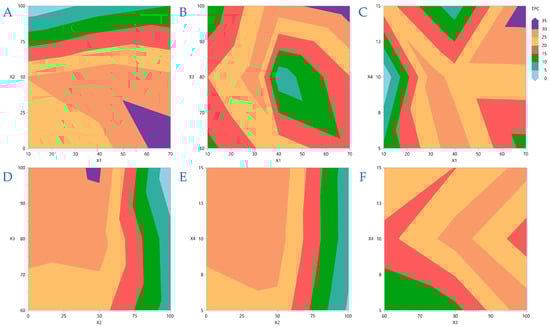 Contour plots for TPC (mg GAE/g dw): plot (A) represents the covariation of X1 (liquid-to-solid ratio) and X2 (ethanol concentration in water); plot (B) represents the covariation of X1 and X3 (ultrasound energy); plot (C) represents the covariation of X1 and X4 (extraction time); plot (D) represents the covariation of X2 and X3; plot (E) represents the covariation of X2 and X4; plot (F) represents the covariation of X3 and X4.