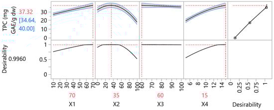 Prediction profiler for the extraction process of phytochemicals. The red number (e.g., 37.32) represents the predicted TPC at the optimal point. The blue interval [34.64, 40.00] shows the 95% confidence interval for the prediction. Squares indicate the predicted response values at the selected factor levels, as generated by the statistical software.