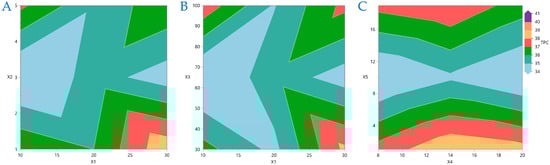 Contour plots are a powerful graphical technique that visualizes three-dimensional interactions on a two-dimensional plane. By rendering complex interactions as topographical visuals, these plots offer intuitive insights into variable relationships. This analysis process enables quick recognition of interaction effects between variables. In Figure 2A, the covariation of X1 and X2 is depicted, and it is obvious that higher liquid-to-solid ratios necessitate lower ethanol concentrations. Similarly, Figure 2B,C depict the covariations between X1 and X3 and X1 and X4, respectively, and it is concluded that higher ratios have a better impact when higher US energy and extraction durations are applied. In Figure 2D, it is obvious that average ethanol concentrations are more efficient at higher US energy is applied, while Figure 2E,F indicate that there are no significant interactions between X2 and X4 and between X3 and X4.