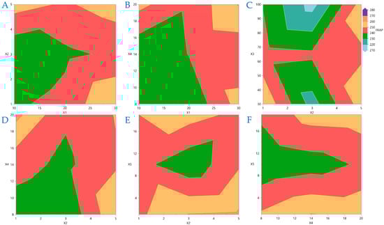 For FRAP (μmol AAE/g dw), plot (A) represents the covariation of X1 (distance between material surface and plasma source) and X2 (material thickness); plot (B) shows the covariation of X1 and X4 (nitrogen flow rate); plot (C) illustrates the covariation of X2 and X3 (plasma power level); plot (D) shows the covariation of X2 and X4; plot (E) presents the covariation of X2 and X5 (exposure time); plot (F) illustrates the covariation of X4 and X5.