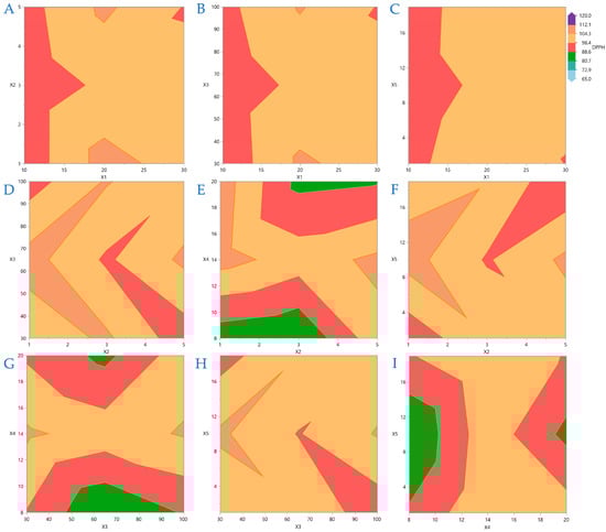 For DPPH (μmol AAE/g dw), plot (A) represents the covariation of X1 (distance between material surface and plasma source) and X2 (material thickness); plot (B) shows the covariation of X1 and X3 (plasma power level); plot (C) illustrates the covariation of X1 and X5 (exposure time); plot (D) shows the covariation of X2 and X3; plot (E) presents the covariation of X2 and X4 (nitrogen flow rate); plot (F) illustrates the covariation of X2 and X5; plot (G) represents the covariation of X3 and X4; plot (H) depicts the covariation of X3 and X5; plot (I) illustrates the covariation of X4 and X5.
