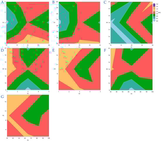 For AAC (mg/g dw), plot (A) represents the covariation of X1 (distance between material surface and plasma source) and X2 (material thickness); plot (B) shows the covariation of X1 and X3 (plasma power level); plot (C) illustrates the covariation of X1 and X4 (nitrogen flow rate); plot (D) shows the covariation of X2 and X4; plot (E) presents the covariation of X2 and X5 (exposure time); plot (F) illustrates the covariation of X3 and X4; plot (G) represents the covariation of X3 and X5.