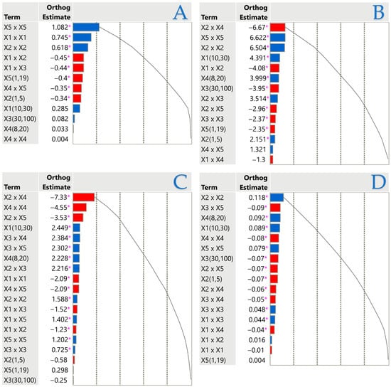 Regression models pertaining to the extraction process are shown in Equations (8)–(11). These models predict important response variables such as TPC, FRAP, DPPH, and AAC. The models contain only significant terms, and they indicate how each variable affects the extraction efficiency. The non-linear relationship between variables, as indicated by the linear and quadratic terms, reveals conditions that maximize antioxidant yield. The presence of interaction terms indicates that the cumulative effects of various variables affect antioxidant potential, highlighting the necessity for meticulous parameter optimization. Extended extraction durations facilitate the dissolution of additional bioactive compounds, including antioxidants, into the solvent. The presence of quadratic terms (such as X12, X22, etc.) and interactions (X1 × X2, X1 × X3, X4 × X5, etc.) implies that extraction time possesses an optimal range—insufficient duration may restrict compound release, whereas prolonged periods could result in degradation or diminished efficiency. The interaction terms suggest that extraction time operates in conjunction with other factors. The models contained only significant terms. Equations: