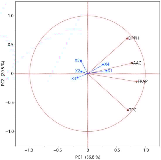 A PCA plot was implemented to enable a more thorough analysis of the data and to extract additional insights from the variables under investigation, as shown in Figure 9. The model accounted for 77.3% of the variance. The purpose of the correlation analyses was to determine the presence of any associations between TPC, FRAP, DPPH, and AAC and the variables under investigation. In this context, the effects of the independent variables on these measures were deemed statistically significant. DPPH and AAC have a positive correlation with X1 and X4 parameters, while FRAP and TPC have a moderate positive correlation. This may be due to the fact that the combination of nitrogen flow and the distance between the material surface and the plasma source may lead to the generation of reactive forms of nitrogen that are capable of disrupting MOL cell membranes to a sufficient extent to recover bioactive compounds and ascorbic acid, thus enhancing the extraction efficiency. All four responses display a negative correlation with parameters X2, X3, and X5.