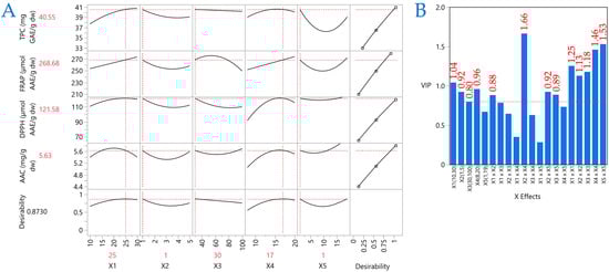 Table 7 provides the model’s proposed optimal covariates for each response separately, along with the model desirability and the optimal values obtained by stepwise regression. All models show excellent desirability (>0.9), indicating how correctly the selected statistical model has been applied to the data. Regarding parameter X1, TPC and FRAP require the highest value (e.g., 30 mm), while DPPH and AAC require an intermediate value (24 and 20 mm, respectively). For parameter X2, all responses are in agreement that the optimal condition requires 1 mm. When it comes to plasma energy (parameter X3), it appears that each response demands different energy, as only TPC and AAC concur with the lowest possible existing energy, FRAP slightly higher energy, while DPPH demands the highest plasma energy to drive the maximum performance. Regarding the nitrogen flow (X4), all responses settle at the same value of 17 L/min, with only a slight variation in FRAP requiring 19 L/min. Finally, considerable differences are observed in the process duration (X5), as TPC and FRAP lead to maximum yield in only 1 min, while DPPH and AAC lead to the maximum yield in the highest possible duration of 19 min.