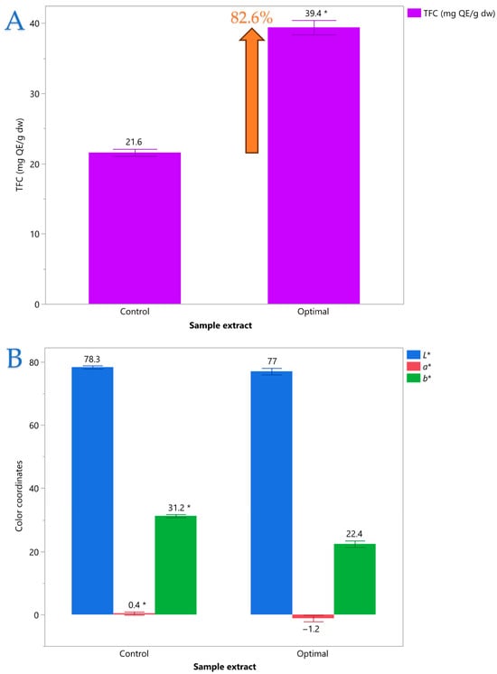 Comparative bar plot of (A) total flavonoid content (TFC) and (B) CIELAB color coordinates (L*, a*, b*) in control and optimal sample extracts, with significant differences marked by an asterisk (*).