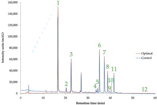 Representative HPLC chromatogram at 280 nm of the optimized dry MOL obtained through plasma treatment (optimal) and Control (without plasma treatment), illustrating the identified polyphenolic compounds. 1: neochlorogenic acid; 2: catechin; 3: chlorogenic acid; 4: ferulic acid; 5: rutin; 6: quercetin 3-D-galactoside; 7: quercetin 3-β-D-glucoside; 8: kaempferol–3-glucoside; 9: isorhamnetin–3-O-glucoside; 10: apigenin–7-O-glucoside; 11: myricetin; 12: apigenin.