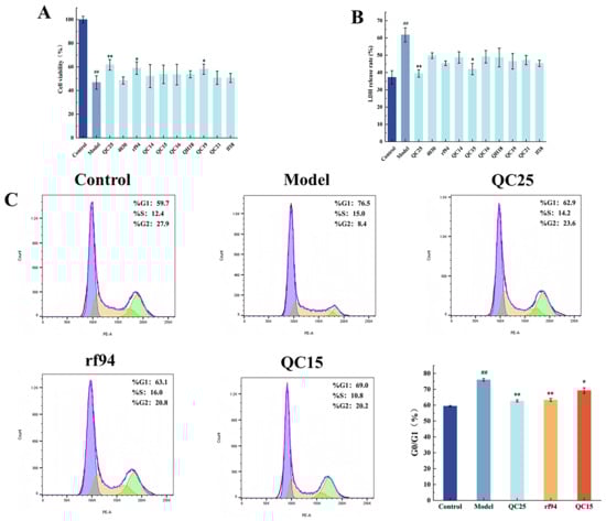 In this experiment, a cellular model was established using 500 µmol/L MPP+. MTT assay results (Figure 1A) showed that compared to the control group, cell viability in the model group was significantly reduced to 46% (## p < 0.01). Compared to the model group, cell viability in the QC25, rf94, and QC19 groups was significantly increased, with the QC25 group achieving a cell survival rate of 61.44% (** p < 0.01). In the LDH release assay results (Figure 1B), the LDH release rates in the QC25 and QC15 groups were 39% and 41%, respectively, significantly lower than that of the model group. To further identify the extract offering the optimal protective effect on the Parkinson’s disease model cells, extracts from the three varieties QC25, rf94, and QC15 were selected for intervention, followed by cell cycle analysis. As shown in Figure 1C, relative to the model group, the QC25-treated group exhibited the most pronounced decrease in the proportion of cells in the G0/G1 phase (** p < 0.01), indicating enhanced cell division and alleviation of apoptosis. These results collectively demonstrate that the QC25 variety provides the best neuroprotective effect against damage in the PD cell model. Therefore, the QC25 variety was selected for subsequent experiments.