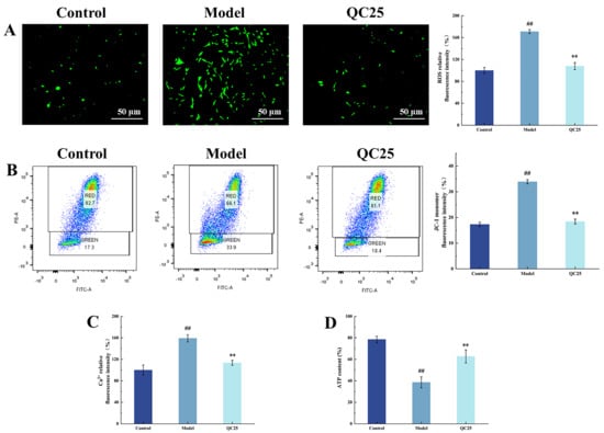 Cells were cultured to the logarithmic growth phase and seeded in plates. After 24 h treatment of the control group, model group, and QC25 group, the cells were washed with pre-cooled buffer to remove the culture medium. Subsequently, DCFH-DA was added and co-incubated with the cells for 30 min, followed by washing to remove unbound probes. Fluorescence images were captured under an inverted fluorescence microscope at high magnification, and fluorescence intensity was measured using a microplate reader (excitation wavelength: 488 nm, emission wavelength: 525 nm).