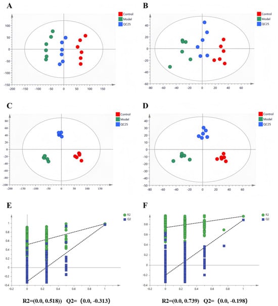 Further validation via supervised partial least squares-discriminant analysis (PLS-DA) confirmed intergroup separation in both positive and negative ion modes Figure 3C,D, aligning with PCA results and confirming successful establishment of the MPP+-induced PD model and QC25 intervention efficacy. Model reliability was evidenced by Q2 regression lines intersecting the negative y-axis in permutation tests Figure 3E,F, demonstrating robust stability and predictive capacity without overfitting.