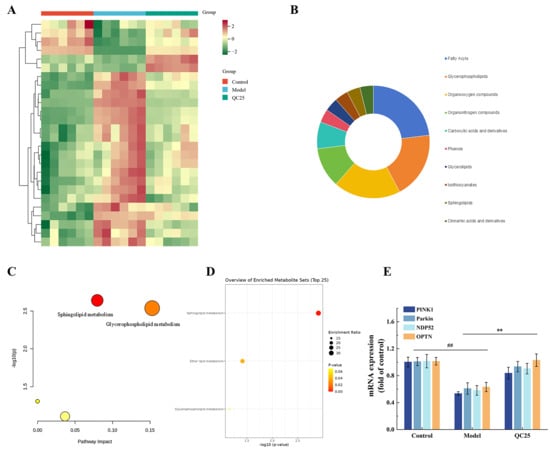 (A) Heatmap of different metabolites. (B) Classification of differential metabolites. (C) The KEGG enrichment analysis showed highly affected metabolites sets. (D) The KEGG analysis showed highly affected pathways. (E) The mRNA expression levels of PINK1, Parkin, NDP52, and OPTN in each group.Data are shown as the mean ± SEM, n = 5, ## p < 0.01 versus Control group; ** p < 0.01 versus Model group.
