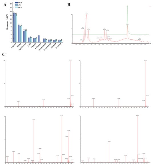 (A) UHPLC-Q/TOF-MS Identification of active ingredients in broad bean QC25, rf94 and QC15 (top ten substances with the highest response values). (B) Overlay of chromatograms of QC25 extract and 6-gingerol. The red chromatogram represents the sample, and the green chromatogram represents 6-gingerol. (C) MS and MS/MS spectra of QC25 extract and 6-gingerol. The spectra on the left correspond to 6-gingerol, and those on the right correspond to QC25 extract.