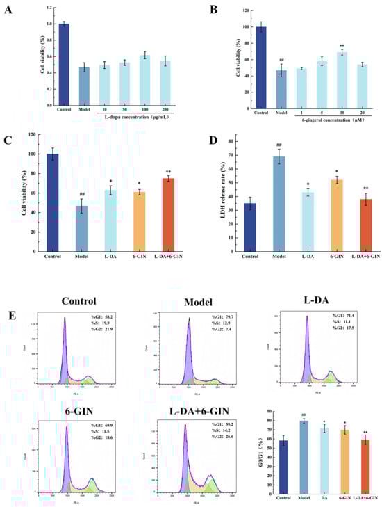 Effects of L-DA, 6-GIN, and L-DA + 6-GIN treatments on Parkinson’s disease model cells. (A) Screening for the Optimal Concentration of Levodopa. (B) Screening for the Optimal Concentration of 6-Gingerol. (C) Cell Viability. (D) Cell LDH Release Rate. (E) Cell Cycle. Data are shown as the mean ± SEM, n = 5, ## p < 0.01 versus Control group; * p < 0.05, ** p < 0.01 versus Model group.