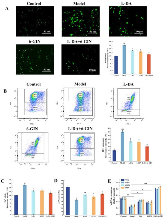 (A) Effects of L-DA, 6-GIN, and L-DA+6-GIN Treatment on Intracellular ROS Levels. (B) Mitochondrial Membrane Potential. (C) Calcium Ion Concentration. (D) ATP Content. (E) The mRNA expression levels of PINK1, Parkin, NDP52, and OPTN in each group. Data are shown as the mean ± SEM, n = 5, ## p < 0.01 and ### p < 0.001 versus Control group; * p < 0.05, ** p < 0.01 and *** p < 0.001 versus versus Model group.