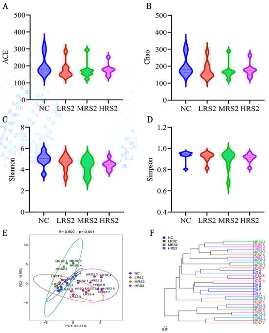 Effect of graded concentrations of RS2 on alpha- and beta-diversity after 48 h of in vitro fermentation. (A): ACE index, (B): Chao1 index, (C): Shannon index, (D): Simpson index, (E): principal-coordinate analysis (PCoA) and (F): Hierarchical clustering. Experimental treatments included NC (negative control, 0 g/L), LRS2 (5 g/L), MRS2 (10 g/L), and HRS2 (15 g/L) of Hi-Maize 260 (n = 8 per group, with 4 female and 4 male replicates). One-way ANOVA with Tukey’s post hoc test was performed.