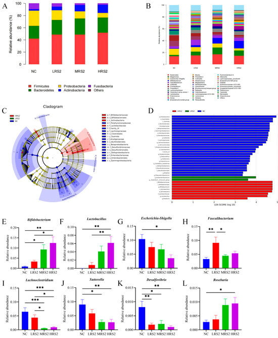 Relative abundance of bacteria at (A): the phylum level, (B): genus level, (C): LDA score and (D): Lefse analysis of gut microbiota. Relative abundance of significantly different bacterial genera at genus level ((E): Bifidobacterium, (F): Lactobacillus, (G): Escherichia-Shigella, (H): Faecalibacterium, (I): Lachnoclostridium, (J): Sutterella, (K): Desulfovibrio and (L): Roseburia)). Experimental treatments included NC (negative control, 0 g/L), LRS2 (5 g/L), MRS2 (10 g/L), and HRS2 (15 g/L) of Hi-Maize 260 (n = 8 per group, with 4 female and 4 male replicates). One-way ANOVA with Tukey’s post hoc test was performed. Significant correlations were marked by * p < 0.05; ** p < 0.01; *** p < 0.001.