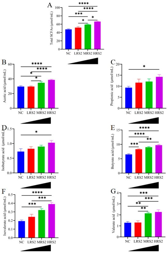 Changes in SCFA during fermentation. (A): Total SCFAs, (B): acetic acid, (C): propionic acid, (D): isobutyric acid, (E): butyric acid, (F): isovaleric acid and (G): valeric acid. Experimental treatments included NC (negative control, 0 g/L), LRS2 (5 g/L), MRS2 (10 g/L), and HRS2 (15 g/L) of Hi-Maize 260 (n = 8 per group, with 4 female and 4 male replicates). One-way ANOVA with Tukey’s post hoc test was performed. Significant correlations were marked by * p < 0.05; ** p < 0.01; *** p < 0.001, **** p < 0.0001.