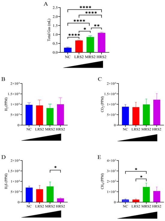 Gas production during in vitro fermentation of RS2 by human gut microbiota. (A): Total gas production, (B): hydrogen (H2), (C): carbon dioxide (CO2), (D): hydrogen sulfide (H2S), and (E): methane (CH4). Experimental treatments included: NC (negative control, 0 g/L), LRS2 (5 g/L), MRS2 (10 g/L), and HRS2 (15 g/L) of Hi-Maize 260 (n = 8 per group, with 4 female and 4 male replicates). One-way ANOVA with Tukey’s post hoc test was performed. Significant correlations were marked by * p < 0.05; ** p < 0.01; **** p < 0.0001. Absence of symbols denotes no significant difference among the four groups.