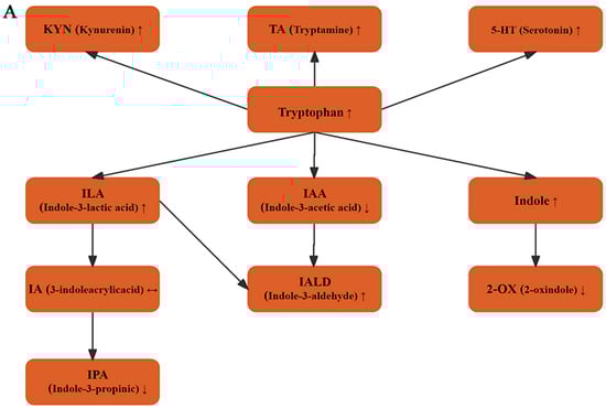 The correlation between the top 30 most abundant gut microbiota and tryptophan metabolites was also examined. In Figure 6C, Bifidobacterium was positively correlated with ILA, Indole, IALD, Tryptophan, and negatively correlated with IAA and KYN. Lactobacillus was positively correlated with TA, ILA, Indole, IALD, and 5-HT, and negatively correlated with IAA and KYN. The significant reduction in Parabacteroides was associated with positive correlations with ILA, Indole, IALD, Tryptophan, and negative correlations with IAA and KYN. Conversely, the significant reduction in Parabacteroides was also negatively correlated with ILA, Indole, IALD, Tryptophan, and 5-HT, and positively correlated with IAA, IPA, KYN. Sutterella was negatively correlated with Indole, IALD, and 5-HT, and positively correlated with IAA, KYN. Lachnoclostridium was negatively correlated with TA, ILA, Indole, IALD and 5-HT, and positively correlated with IAA, IPA and KYN.