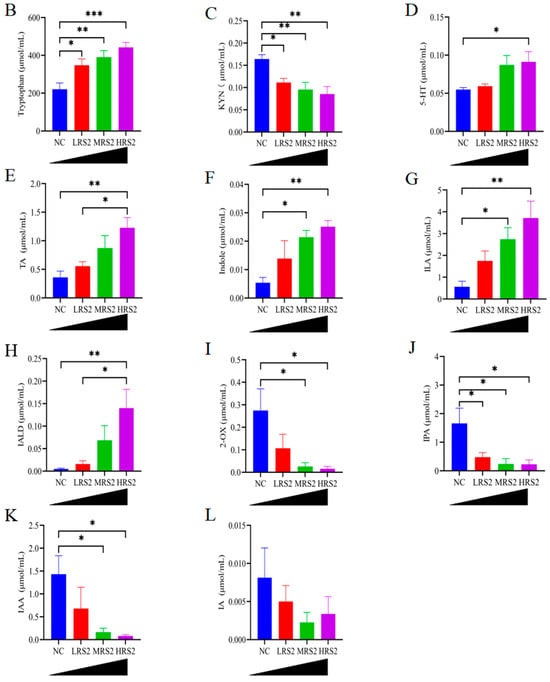 RS2 affects the tryptophan metabolites produced by human gut microbiota during the fermentation. (A): Tryptophan metabolism pathway diagram, (B): Tryptophan, (C): KYN, (D): 5-HT, (E): TA, (F): Indole, (G): ILA, (H): IALD, (I): 2-OX, (J): IPA, (K): IAA and (L): IA. Experimental treatments included NC (negative control, 0 g/L), LRS2 (5 g/L), MRS2 (10 g/L), and HRS2 (15 g/L) of Hi-Maize 260 (n = 8 per group, with 4 female and 4 male replicates). One-way ANOVA with Tukey’s post hoc test was performed. Significant correlations were marked by * p < 0.05; ** p < 0.01; *** p < 0.001. Absence of symbols denotes no significant difference among the four groups. Upward arrows represent an increase in content, while downward arrows represent a decrease.
